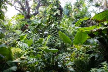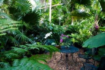 Behold rainforest color, shape and pattern, romantic palms in every shade of green, pastel Datura's, white, pink, yellow, and peach, orchids of every hue, the vibrant colors of bougainvillea and heliconias, soft tree ferns, giant elephant ears.