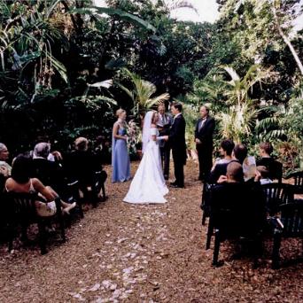 20 guests Chairs arranged with center aisle Path strewn with rose petals